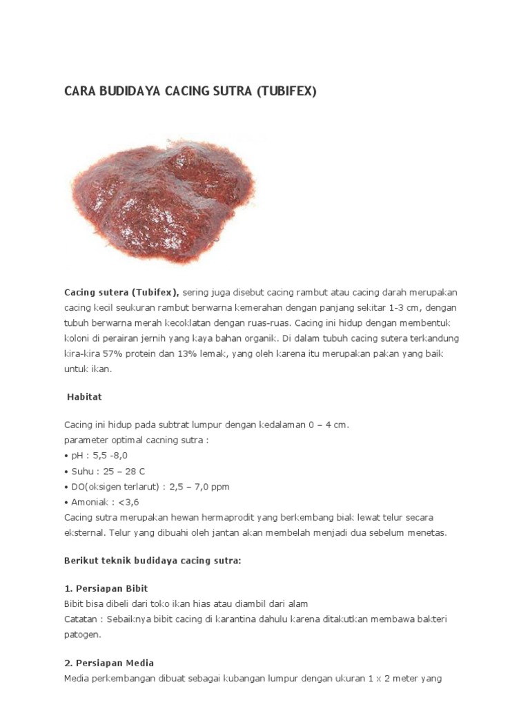 Cara Budidaya Cacing Sutra Praktis dan Menguntungkan ... from cdn.statically.io Tubifek/cacing sutra sangat cocok untuk makanan larva karena ukuranya yang sangat kecil dan mampu bertahan hidup diair selama 3hari. Cacing sutra bisa hidup di media lumpur dengan kedalaman 0 sampai 4 cm. Karena mudahnya budidaya hewan yang satu ini, membuat beberapa orang tertarik untuk mencoba melakukan tips cara budidaya cacing sutra sederhana. Cara panen cacing sutra panen cacing sutra. 6 cara budidaya cacing sutra paling mudah. Cacing sutra banyak dicari orang karena memiliki banyak sekali manfaat, terutama bagi para peternak. Tampaknya jenis budidaya ini memang aneh, bahkan banyak yang menganggap bahwa cacing yang satu ini tidak terlalu menguntungkan. Cara memilih indukan cacing sutra berkualitas.