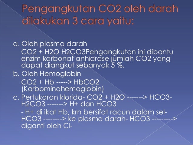 Pengangkutan co2 oleh darah dapat dilaksanakan melalui 3 cara yakni sebagai berikut. Dengan elevasi dan depresi tulang iga Pengangkutan terbesar terjadi dengan cara. 1) pengangkutan karbondioksida dalam bentuk terlarut. Proses pengangkutan karbondioksida (co2) di dalam darah dilaksanakan melalui tiga cara, yaitu: